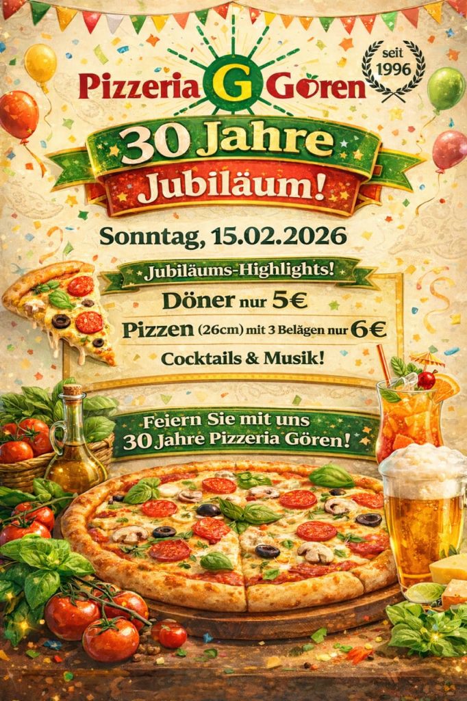 Seit 1996 stehen wir für frische Zutaten, echte Handwerkskunst und den unverwechselbaren Geschmack unserer Spezialitäten. Am Sonntag, den 15.02.2026, feiern wir gemeinsam mit Ihnen 30 Jahre Pizzeria Gören – und laden Sie herzlich ein, diesen besonderen Tag mit uns zu erleben!